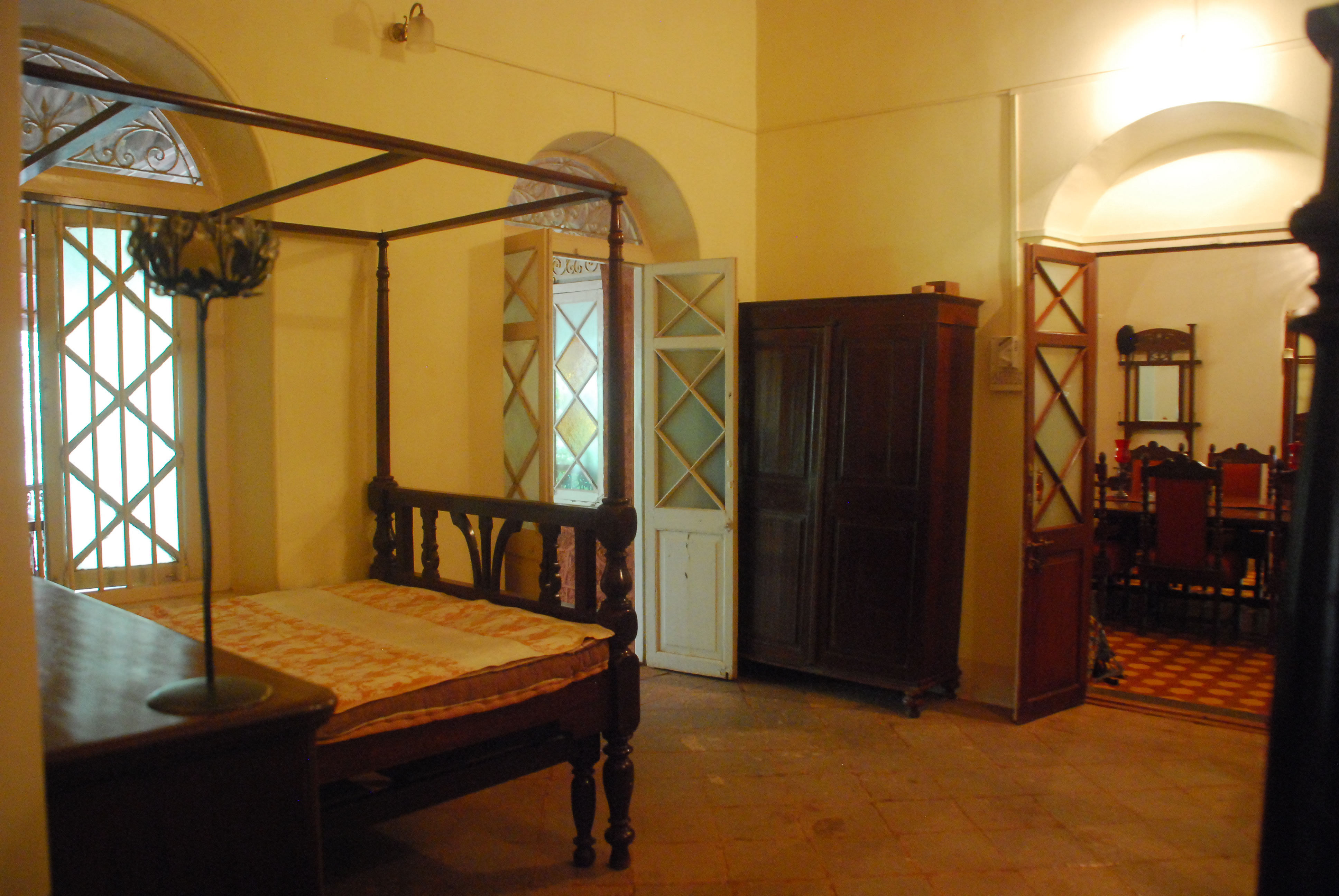 A heritage villa in Matheran, almost a 100 year old shelters some of the most amazing wall clocks, furniture, flooring, beds, wide windows, huge walls and colorful culinary. Every corner of the house speaks an emotion. If you wish to detox your mind with a good read, you will find this huge sofa with sunlight at its backdrop an apt place to be the couch potato for rest of the day! This vintage bungalow is a home to antique floorings and furniture. The mosaic tiles in verandah ranging from occur to red color, adds to the heritage feel of this place. With each room having an entrance into the verandah, they all share a common area, meant to be the Living room, which is a semi-private space. Using the tones of white, the kitchen is tastefully designed to give a rustic feel; It is here where the family sits together for intimate meals/breakfast. The caretakers serve you delicious home cooked food made using the fresh vegetables available. The bungalow means to provide you a state of solitude, tranquility, and peace.